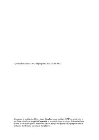 Este documento proporciona instrucciones para instalar la última versión de GIMP, un programa de edición de imágenes gratuito y de código abierto. Explica que la instalación es sencilla y solo requiere seguir los pasos guiados. Ofrece enlaces para descargar e instalar tanto la versión estándar como la portable de GIMP 2.6.11 para Windows. La instalación guiada reconocerá automáticamente el idioma del sistema operativo y extraerá los archivos necesarios en uno o dos minutos.