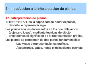 Este documento presenta una introducción a la interpretación de planos. Explica los conceptos básicos de planos como las vistas, anotaciones y tipos de planos como los de conjunto y despiece. También describe las normas para la lectura de vistas, anotaciones y representación de planos de conjunto y despiece.