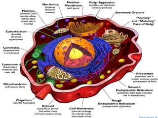 Este documento presenta una introducción a la fisiología celular. Explica la organización estructural de la célula a nivel químico, celular, tisular y sistémico. Describe las principales organelas celulares como el retículo endoplásmico, el aparato de Golgi, las mitocondrias y los lisosomas, y sus funciones. También define la fisiología celular y sus divisiones, incluida la fisiología celular, sistémica y de los principales sistemas del cuerpo.