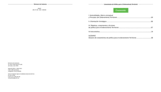 Este documento presenta lineamientos de política para el ordenamiento territorial en Perú. Contiene cuatro secciones: 1) generalidades y principios del ordenamiento territorial, 2) orientación estratégica, 3) objetivos, lineamientos y acciones de política, e 4) instrumentos. El ordenamiento territorial es un proceso político y técnico para la ocupación ordenada y uso sostenible del territorio considerando criterios ambientales, económicos, sociales e institucionales. La orientación estratégica es promover una base productiva competitiva y sostenible en todas las regiones.