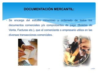 Este documento describe los diferentes tipos de documentos mercantiles que utilizan los comerciantes y empresarios en sus transacciones comerciales, como boletas de venta y facturas. Explica que la documentación mercantil se encarga del estudio ordenado de todos estos documentos y comprobantes de pago. También presenta los diferentes elementos que componen un sistema de calidad como el manual de calidad, procedimientos, instructivos y registros.