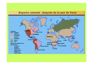 El documento describe el imperialismo y colonialismo europeo entre los siglos XIX y XX. Explica que Europa expandió su dominio político y militar sobre amplias regiones de África y Asia, estableciendo colonias. Factores económicos, demográficos, políticos e ideológicos facilitaron la expansión colonial. La Conferencia de Berlín de 1884-1885 repartió formalmente el continente africano entre las potencias europeas. Gran Bretaña y Francia fueron los principales imperios coloniales, controlando regiones de Asia, África y otras