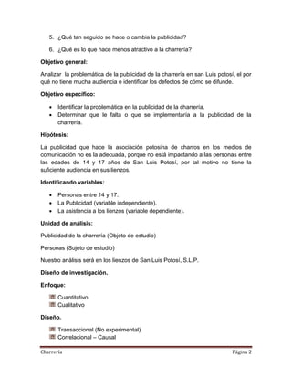 Este documento presenta un proyecto de investigación sobre la problemática de la publicidad de la charrería en San Luis Potosí. El objetivo es analizar por qué la charrería tiene poca audiencia y identificar defectos en su difusión. La hipótesis es que la publicidad de la asociación de charros no es adecuada para atraer a personas de 14 a 17 años. El diseño de investigación incluirá técnicas como observación, entrevistas y encuestas aplicadas en lienzos de la ciudad entre enero y mayo.