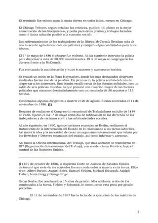 El 1 de mayo se conmemora el Día Internacional de los Trabajadores, en honor a la lucha por derechos laborales que se agudizó en el siglo XIX con el crecimiento del proletariado y el surgimiento de sindicatos. El movimiento de 1886 en Chicago, que exigía la jornada laboral de ocho horas, culminó en violentos enfrentamientos que resultaron en varias muertes y juicios injustos de líderes obreros, conocidos como los 'mártires de Chicago'. En 1889, la Segunda Internacional estableció el 1 de mayo como día de reivindicación de los derechos laborales, creando así la base para la formación de la Organización Internacional del Trabajo (OIT).