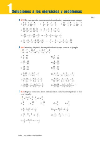 1) El documento presenta soluciones a ejercicios de operaciones con números enteros y fracciones. Incluye cálculos con potencias y raíces.