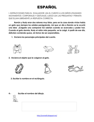 Este documento es una prueba de diagnóstico para un alumno de primer grado que incluye preguntas sobre español, matemáticas, exploración de la naturaleza y sociedad, y formación cívica y ética. La prueba evalúa habilidades como colorear, unir, tachar, encerrar y escribir para medir el progreso del alumno en diferentes asignaturas.