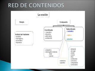 Este documento trata sobre las oraciones simples y compuestas. Explica las partes de la oración simple como el sujeto, verbo, complementos y atributos. También describe los tipos de oraciones compuestas como coordinadas y subordinadas, indicando sus funciones.