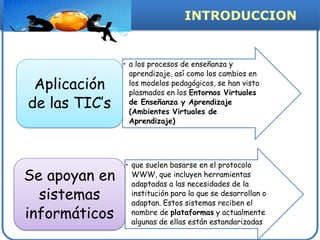 Este documento introduce los ambientes virtuales de aprendizaje y las plataformas educativas. Explica que las plataformas educativas se basan en sistemas informáticos y el protocolo WWW para administrar cursos y permitir que docentes y estudiantes interactúen y accedan a contenidos de manera asincrónica y sincrónica. También clasifica diferentes tipos de plataformas y describe cómo pueden usarse para apoyar el aprendizaje a distancia y blended learning.