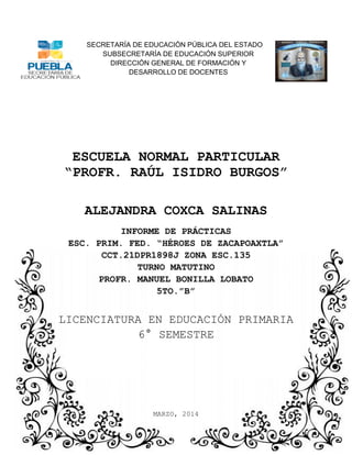 Este documento es un informe de prácticas realizadas por Alejandra Coxca Salinas en la Escuela Primaria Federal "Héroes de Zacapoaxtla" durante marzo de 2014. El informe detalla la práctica de enseñanza realizada por Alejandra Coxca Salinas en el grupo 5to."B" como parte de los requisitos de la Licenciatura en Educación Primaria en su sexto semestre bajo la supervisión del profesor Manuel Bonilla Lobato.