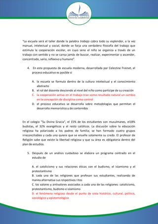 El documento presenta 15 preguntas de selección múltiple con una única respuesta correcta cada una. Las preguntas abarcan diversos temas como arte, educación, lenguaje y ciencias. El profesor solicita a los maestros que las primeras 10 preguntas resaltadas en rojo contienen la respuesta correcta.