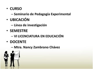 Este documento presenta la información sobre un seminario de pedagogía experimental que incluye el objetivo de capacitar a los estudiantes en el diseño de proyectos de investigación educativa mediante métodos experimentales. El seminario cubrirá temas como diseños experimentales, investigación cualitativa y cuantitativa, y desarrollará las habilidades de los estudiantes para diseñar e implementar su propio proyecto de investigación educativa experimental. El seminario consistirá en presentaciones, ejercicios prácticos y tareas que guiarán a los estudiantes a