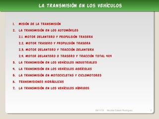 El documento trata sobre la transmisión en diferentes tipos de vehículos, incluyendo automóviles, vehículos industriales, agrícolas y motocicletas. Se discuten las funciones de la transmisión, las resistencias que debe superar y los distintos sistemas de transmisión utilizados en cada tipo de vehículo. Además, se analizan las transmisiones hidráulicas y en vehículos híbridos, considerando cómo se gestionan los mecanismos de propulsión.