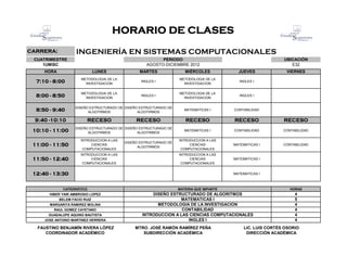 El documento presenta el horario de clases de la carrera de Ingeniería en Sistemas Computacionales para el primer cuatrimestre del año 2012. Se detallan las asignaturas, los días y horarios de las clases, los profesores a cargo de cada materia y la ubicación de las aulas.