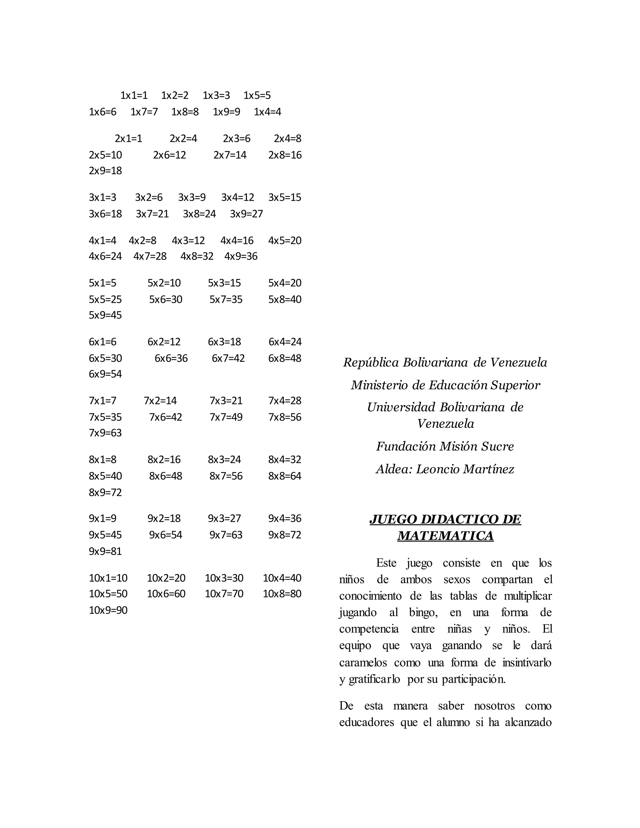 Este documento presenta un juego didáctico de bingo para enseñar las tablas de multiplicar a niños. El juego consiste en que los niños participen en equipos de niñas y niños compitiendo para ver quién completa primero una línea en su tarjeta de bingo con los números que se van cantando. El equipo ganador recibe premios para motivar su aprendizaje. Se proveen instrucciones detalladas para la elaboración del juego y su mecánica.