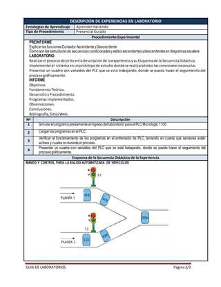 Este documento presenta una guía de laboratorio para una experiencia sobre el control y regulación industrial utilizando un PLC Micrologic 1100. La experiencia involucra el diseño de un sistema de control para la salida automatizada de vehículos de un estacionamiento que consta de dos plantas mediante el uso de sensores y semáforos. El documento describe los objetivos, procedimientos, componentes y esquema de la secuencia didáctica de la experiencia de laboratorio.