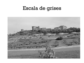 El documento habla sobre conceptos fotográficos como escala de grises, equilibrar colores, brillo y contraste, tono y saturación, subexposición y colores apagados. También menciona técnicas como enmarcar con un paspartú, limpiar, usar máscaras y crear texto como imagen para pegarlo en una fotografía. Se nombran lugares como Calpe y la playa de Málaga, así como temas como logotipos y la naturaleza.