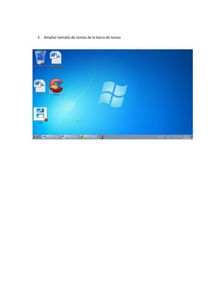 La guía instruye al estudiante en tres pasos: anclar cinco accesos directos en la barra de tareas, abrir diez documentos de Word para ver su agrupamiento en la barra de tareas, y ampliar el tamaño de los iconos en la barra de tareas.