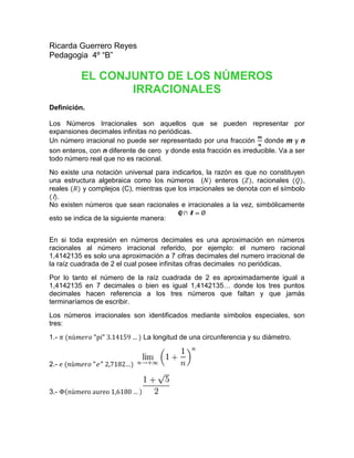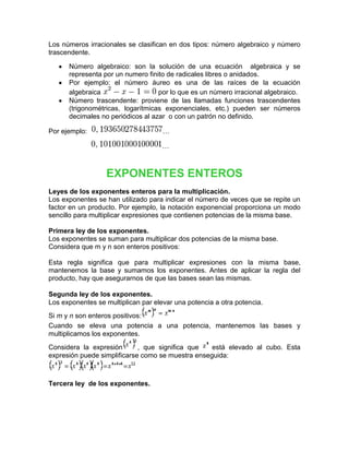 1) Los números irracionales son aquellos que no pueden expresarse como fracciones de números enteros y tienen expansiones decimales infinitas no periódicas. 2) Algunos ejemplos de números irracionales son la raíz cuadrada de 2 y π. 3) Los números irracionales se clasifican en algebraicos, que son soluciones de ecuaciones algebraicas, y trascendentes, que provienen de funciones trascendentes.