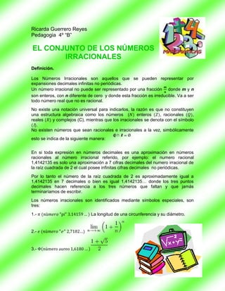 1) Los números irracionales son aquellos que no pueden expresarse como fracciones de números enteros y tienen expansiones decimales infinitas no periódicas.