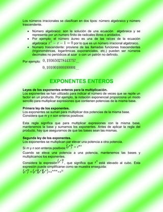 Este documento contiene información sobre números irracionales, exponentes enteros, notación exponencial y modelos algebraicos elementales. En resumen: