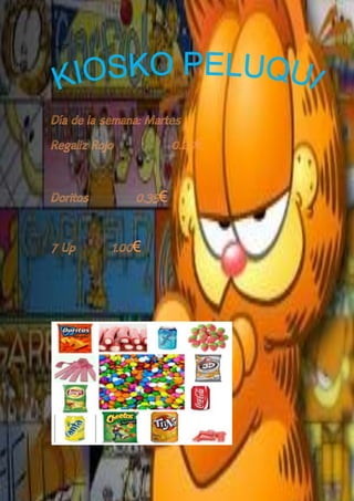 La lista detalla los precios de varios artículos de comida y bebida para cada día de la semana, incluyendo fresitas, pelotazos y Coca-Cola a €0.05, €0.35 y €1.00 respectivamente el lunes; regaliz rojo, Doritos y 7 Up a €0.20, €0.35 y €1.00 el martes; y así sucesivamente para cada día de la semana.
