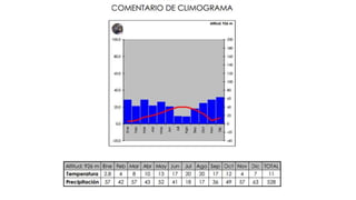 El documento describe las características climáticas de una región con un clima mediterráneo continental. Presenta precipitaciones moderadas e irregulares a lo largo del año, con dos meses secos en verano. La temperatura media anual es fresca con amplias variaciones térmicas entre verano e invierno. El clima se clasifica como semihúmedo.