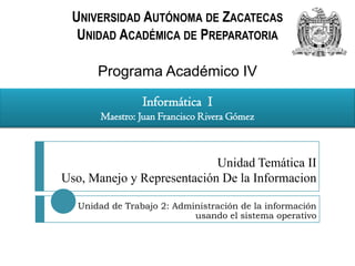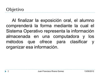 Este documento describe cómo los sistemas operativos representan y organizan la información almacenada en una computadora. Explica que los archivos son la unidad mínima de almacenamiento y pueden clasificarse en carpetas para facilitar su localización. También describe las funciones del administrador de archivos como permitir organizar la información en los dispositivos de almacenamiento a través de nombres y carpetas.