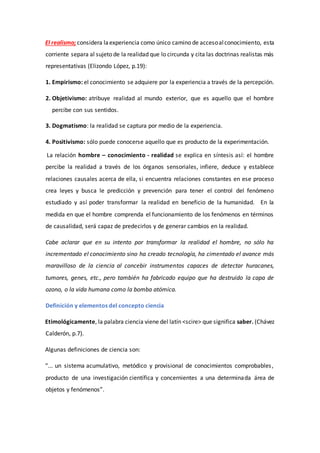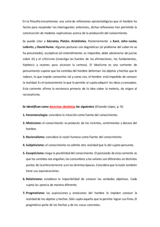 El documento discute varias corrientes filosóficas sobre el conocimiento humano como el idealismo, el realismo y el escepticismo. También define la ciencia como un conjunto sistemático de conocimientos obtenidos a través de métodos como la percepción, la deducción y la experimentación, los cuales permiten al hombre comprender y transformar la realidad. Finalmente, señala que la investigación educativa busca mejorar la práctica docente mediante un proceso sistemático de indagación científica.