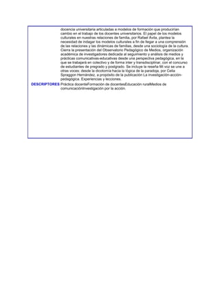 Este documento presenta una colección de artículos que abordan diversos temas relacionados con la educación en Colombia. El primer artículo discute tres desafíos para la Escuela Nueva y propone fortalecer las competencias pedagógicas de los maestros. El segundo examina las complejas relaciones intersubjetivas en los procesos educativos. El tercero plantea que la lengua se ha tenido que legitimar a través de un proceso histórico, en contraste con las evaluaciones masivas. El cuarto evidencia la confusión entre a