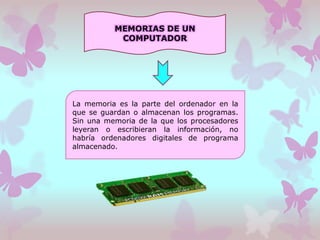 El documento describe las diferentes clasificaciones y tipos de memoria en un ordenador. Se resumen en tres oraciones: La memoria es donde se almacenan los programas y datos de forma temporal. Existen diferentes tipos de memoria como la RAM, ROM, SRAM y DRAM, clasificadas según su volatilidad, forma de acceso y tecnología. La RAM y ROM son las dos grandes clasificaciones de memoria, siendo la RAM volátil donde se ejecutan los programas y la ROM de solo lectura donde residen programas fijos.