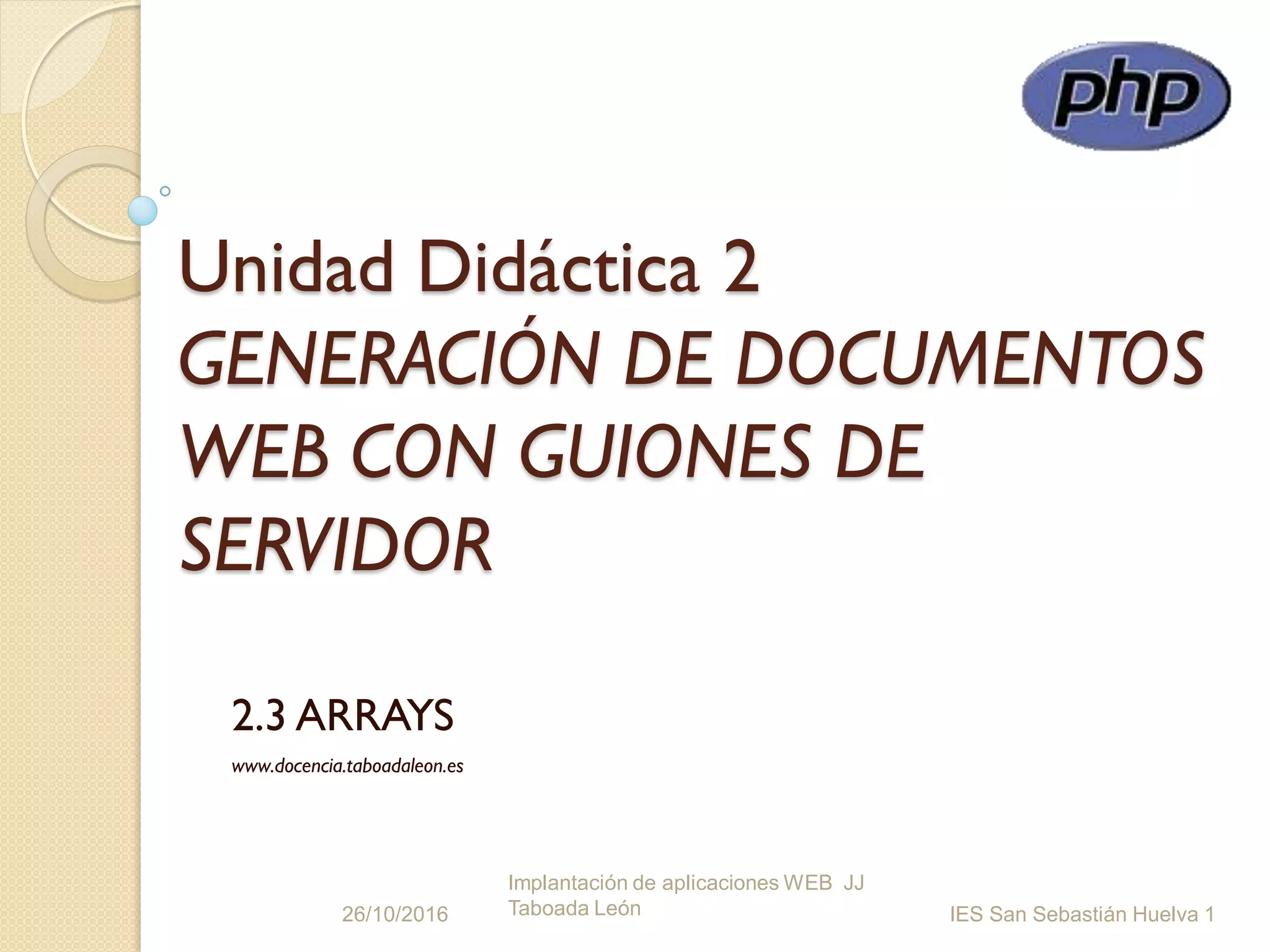 Este documento explica los conceptos básicos de los arrays en PHP, incluyendo arrays escalares y asociativos, operaciones comunes como crear, modificar y ordenar arrays, y usar bucles foreach para recorrer arrays. También cubre arrays bidimensionales y multidimensionales, así como ejemplos de código PHP para trabajar con diferentes tipos de arrays.