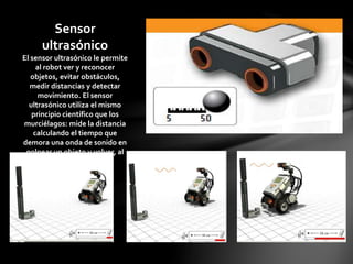 El documento describe el funcionamiento del sensor ultrasónico, el cual utiliza ondas de sonido para medir distancias de objetos y evitar obstáculos, funcionando de manera similar a como los murciélagos usan el eco. El sensor ultrasónico mide distancias de 0 a 2,5 metros con una precisión de 3 centímetros, permitiendo que los robots vean y reconozcan su entorno.