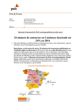 El número de concursos en Cataluña descendió un 24% en 2014, con un total de 1,363 concursos. Barcelona tuvo la mayor cantidad con 1,121 concursos. Los sectores de construcción e inmobiliario representaron el 35% del total de concursos, aunque ambos sectores experimentaron descensos significativos del 41% y 31% respectivamente en comparación con 2013.
