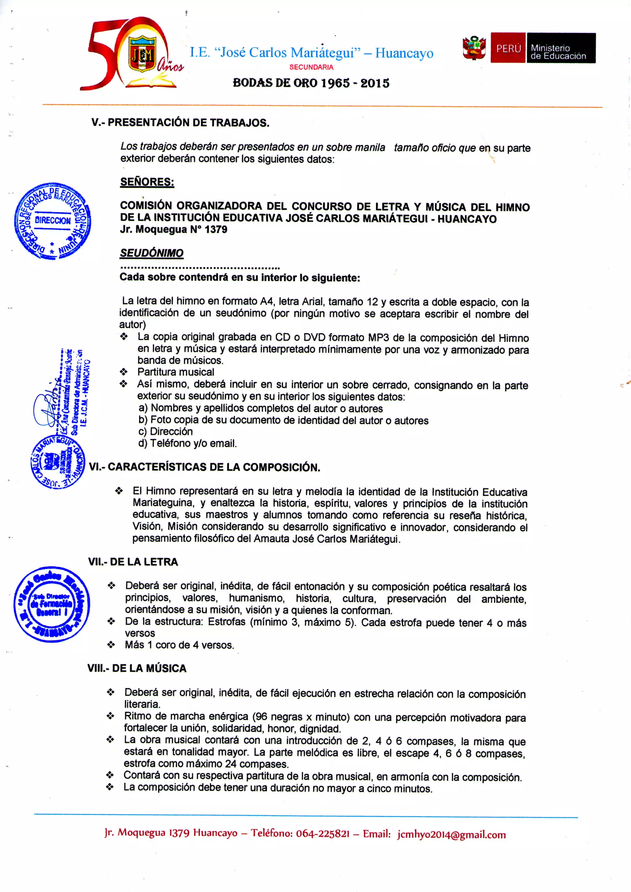 Este documento describe las pautas para la presentación de trabajos para un concurso de himno de una institución educativa en Huancayo, Perú. Los trabajos deben ser presentados de forma anónima en sobres que contengan la letra en formato A4 tamaño 12, una copia de la composición en CD/DVD, y la partitura musical. La letra y música deben representar la identidad e historia de la institución y enaltecer sus valores. La letra debe tener entre 3 y 5 estrofas y un coro, mientras que la música debe ser enérg