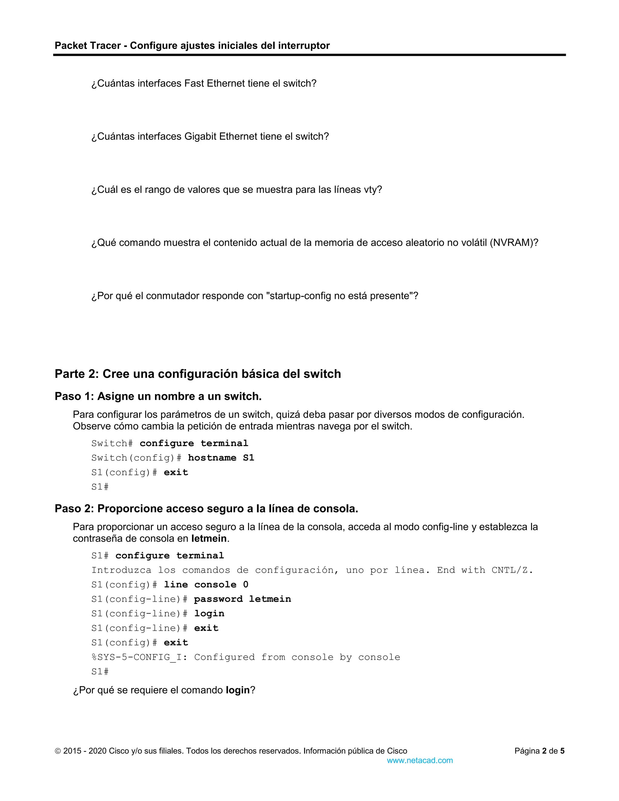 El documento detalla el proceso de configuración inicial de un conmutador Cisco, incluyendo la verificación de la configuración predeterminada, la creación de contraseñas seguras y la configuración de banners de mensajes. Se explican pasos específicos para proteger el acceso a través de contraseñas cifradas y en texto plano, así como la importancia de guardar la configuración en NVRAM. Al final, se instruye al usuario a replicar la configuración en otro conmutador.