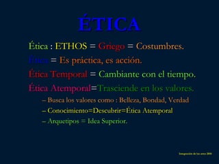 Este documento presenta conceptos clave sobre ética en la educación por el arte. En menos de 3 oraciones, resume que la ética busca valores atemporales como la belleza, bondad y verdad, y que la educación debe cultivar cualidades nobles y altruistas en los estudiantes para enfrentar problemas como la pobreza espiritual, contaminación y corrupción en el mundo.