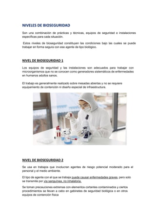 Los niveles de bioseguridad son prácticas y técnicas específicas para trabajar con agentes biológicos, que van desde el nivel 1, con microorganismos sin riesgo, hasta el nivel 4, destinado a agentes peligrosos y exóticos. Cada nivel incluye requisitos de seguridad y formación del personal, así como medidas universales de bioseguridad como el uso de equipos de protección personal. Es fundamental seguir protocolos estrictos de manejo y eliminación de materiales para garantizar la seguridad en el laboratorio.
