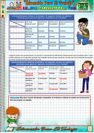 Este documento presenta las instrucciones para una actividad sobre el desarrollo de proyectos de emprendimiento. Se explica que los estudiantes generarán ideas creativas para resolver un problema definido previamente, utilizando la técnica de Da Vinci. Luego, seleccionarán la mejor idea mediante una tabla de evaluación y puntajes. Finalmente, los estudiantes evaluarán su progreso en la actividad y áreas que necesitan mejorar.