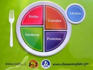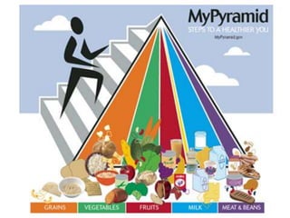Este documento proporciona lineamientos para planear una dieta saludable. Describe los objetivos de nutrición de Healthy People 2010 para promover un peso saludable y el consumo de frutas, verduras, granos enteros y alimentos bajos en grasas saturadas y sodio. Explica la Pirámide Alimentaria y recomienda comer la mayor cantidad de granos, frutas y verduras, y una menor cantidad de grasas y azúcares. También define porciones de alimentos, límites de grasas, azúcares y sod