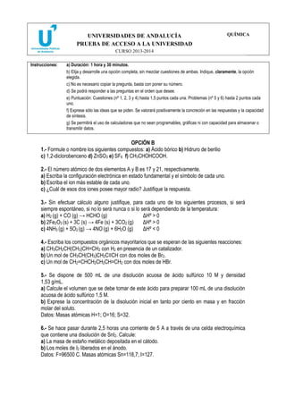 El documento es una prueba de acceso a la universidad en química, con instrucciones para su desarrollo en una duración de 1 hora y 30 minutos. Contiene preguntas sobre la formulación de compuestos, análisis de afirmaciones, justificación de reacciones químicas y resolución de problemas relacionados con las propiedades y reacciones de sustancias químicas. Se evalúan las respuestas por su concreción y capacidad de síntesis, y se permite el uso de calculadoras no programables.