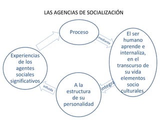 El documento habla sobre los agentes de socialización en la sociología de la educación. Explica que existen diferentes agencias de socialización como la familia, la escuela y los medios de comunicación que ayudan a socializar a las personas durante el proceso de socialización. También distingue entre agentes de socialización primarios y secundarios.