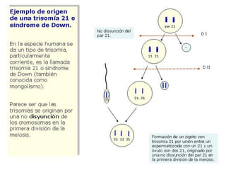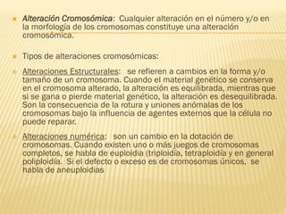 Este documento describe los diferentes tipos de alteraciones cromosómicas, incluyendo alteraciones estructurales como deleciones, duplicaciones, inversiones y translocaciones, que involucran cambios en la forma o tamaño de los cromosomas. También describe alteraciones numéricas como euploidías que involucran variaciones en el número de juegos cromosómicos, y aneuploidías que involucran variaciones en el número de un solo cromosoma. Finalmente, menciona algunas causas comunes de alteraciones cromosómicas como la edad mater