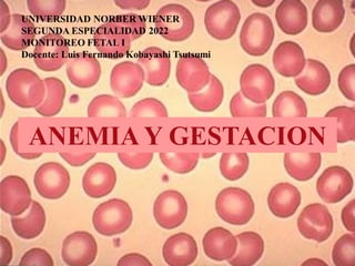 Este documento describe la anemia y los requerimientos de hierro durante el embarazo. Explica que la cantidad total de hierro requerida durante el embarazo es de 840-900 mg, lo que no puede cubrirse solo con la dieta. También describe los tipos de anemia, incluida la anemia ferropénica, y las estrategias de tratamiento y prevención, como la suplementación con hierro.