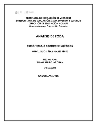 Este documento presenta un análisis FODA realizado por Amayrani Rojas Chan, estudiante de 5° semestre de la Licenciatura en Educación Primaria. El análisis identifica sus fortalezas como la organización, responsabilidad, comunicación y liderazgo, así como oportunidades como el aprendizaje continuo, imaginación y apoyo familiar. Sus debilidades incluyen problemas de carácter, aversión al cambio y nerviosismo, mientras que las amenazas son el miedo al fracaso, malas influencias y falta de