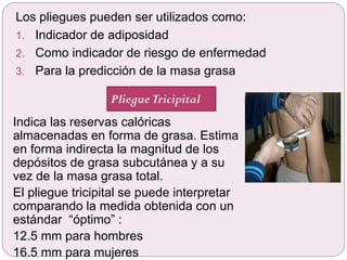 El documento proporciona información sobre diferentes métodos antropométricos para evaluar la composición corporal, incluyendo mediciones de pliegues cutáneos, circunferencia muscular del brazo y cintura, e índice de masa corporal. Describe cómo estas mediciones pueden usarse para estimar la grasa corporal, masa muscular, riesgo de enfermedades y estado nutricional de mujeres embarazadas y lactantes.