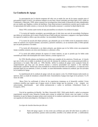 Este documento describe factores que influyen en el apego y la adaptación de niños adoptados. Explica que el apego se desarrolla a través de interacciones tempranas entre el niño y su cuidador principal, generalmente la madre biológica. Sin embargo, este proceso de apego puede transferirse a padres adoptivos si la adopción ocurre con atención y planificación. También discute cómo el abandono por los padres biológicos puede afectar el desarrollo del niño y su capacidad para formar apegos futuro