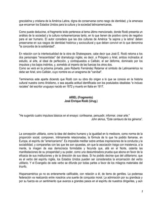 Este documento presenta un taller sobre el texto "Ariel" de José Enrique Rodó. Incluye instrucciones para que los estudiantes resuman y analicen ideas clave del texto como lo que Rodó llama "americanismo", la relación entre creencia e imitación, el concepto de "nordomanía" y los rasgos de la personalidad de América Latina. También proporciona contexto histórico sobre la publicación de la obra y su significado.
