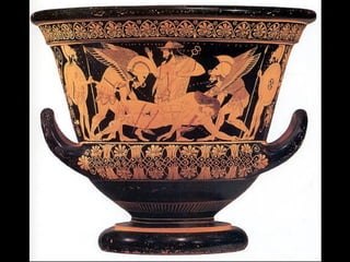 El documento resume la historia del arte griego desde el período micénico hasta el helenismo, destacando los principales períodos artísticos como el arcaico, clásico y helenístico. Explica las características de la arquitectura griega como la proporción, simplicidad y claridad, así como los tres órdenes clásicos. También describe la escultura griega idealizada y su evolución hacia una mayor expresividad en el período helenístico.
