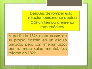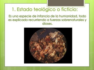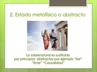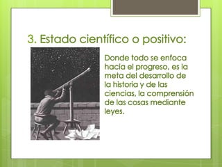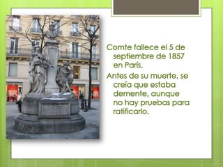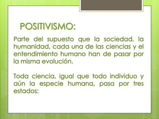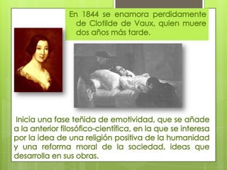 El documento presenta un resumen del contexto histórico y las obras principales del filósofo francés Auguste Comte en 1797. Comte propuso el fenomenismo y el nominalismo, renunció a los juicios de valor y promovió la unidad del método científico.