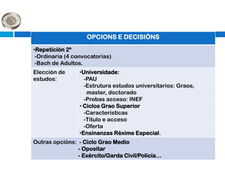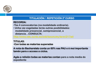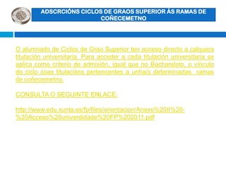 Este documento resume las diferentes opciones educativas y profesionales disponibles después de completar el bachillerato, incluyendo estudios universitarios, ciclos formativos de grado superior y medio, y formación profesional específica. Explica los procesos de admisión, inscripción, y ofertas disponibles en estas áreas. También proporciona enlaces a sitios web con información actualizada.